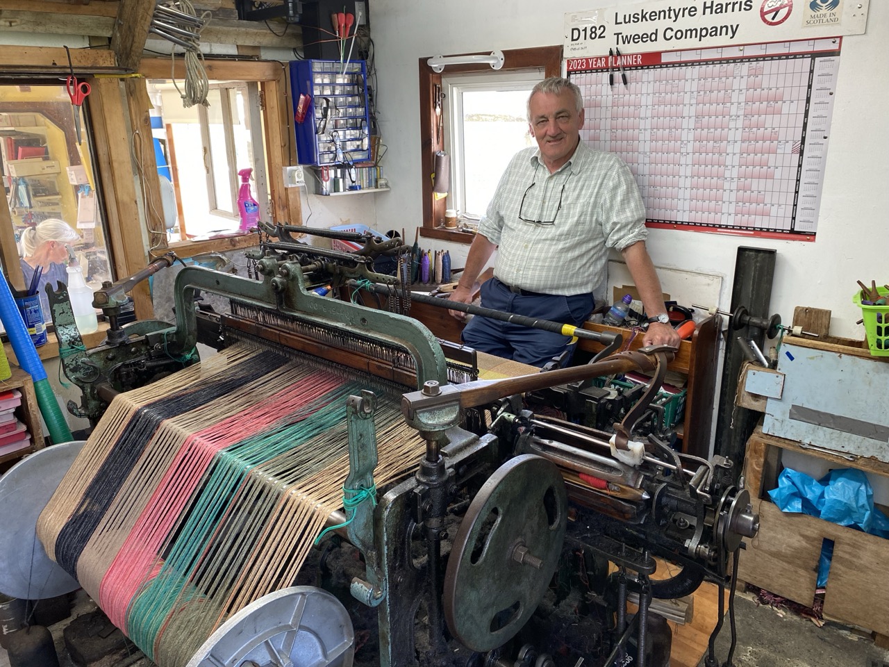 Donald J Mackay weaves Harris Tweed at Luskentyre with loom connected to Hamarsay House.